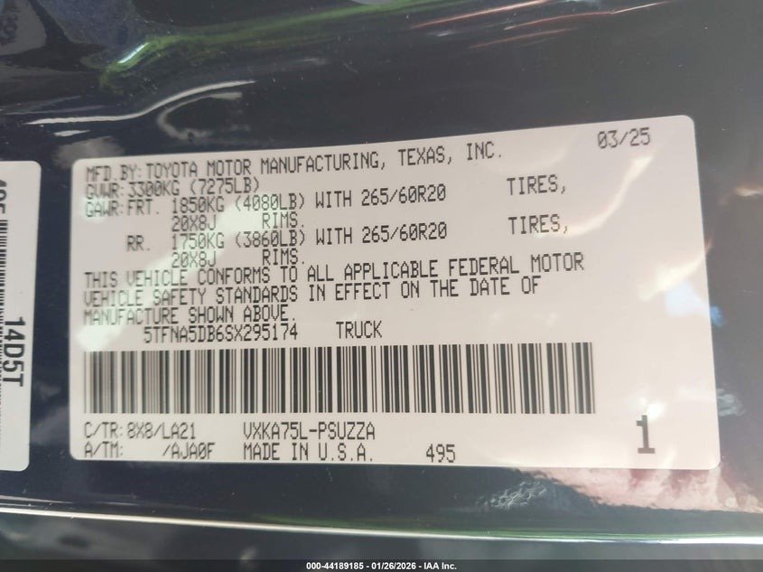 Technical Specifications: 2025 Toyota Tundra (Unit 5TFNA5DB6SX295174